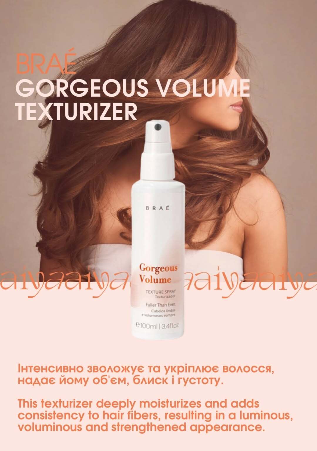 Aiya Beauty Care представляє Braé Gorgeous Volume — легку лінію догляду за волоссям, створену для додання тонкому або плоскому волоссю необхідного об'єму. Насичена об'ємними білками, поживними рослинними екстрактами та зміцнюючими інгредієнтами, Gorgeous Volume забезпечує тривалий об'єм, зберігаючи волосся м'яким і блискучим. Вона ніжно очищує, зміцнює кожен волосок і підкреслює природний об'єм вашого волосся, роблячи її ідеальним вибором для легкої укладки з об'ємом. З Braé Gorgeous Volume ви можете перетворити неживе волосся на яскраві, густі локони, ніби ви щойно вийшли з салону.